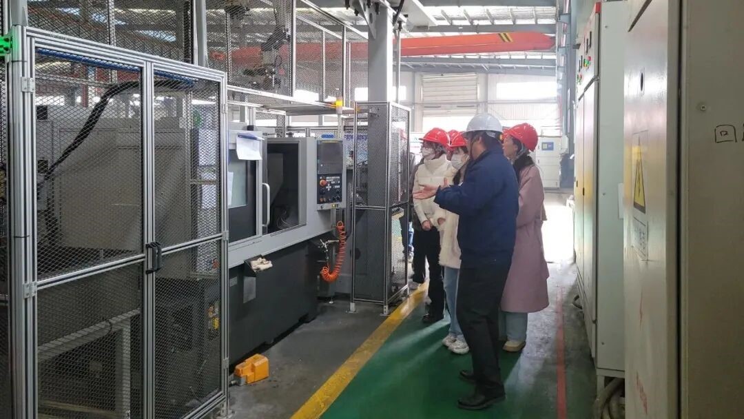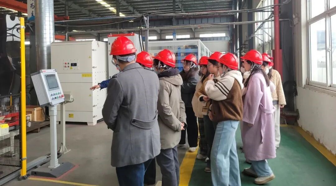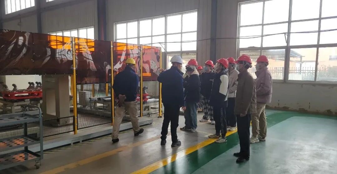 在车间负责人的带领下,学生们依次参观了数控生产线、自动化焊接生产线、喷漆流水线及废气环保处理设施等。技术主管现场讲解了产品从原材料到成品的全流程生产工艺,并演示了自动焊接机器人等自动化设备的操作。